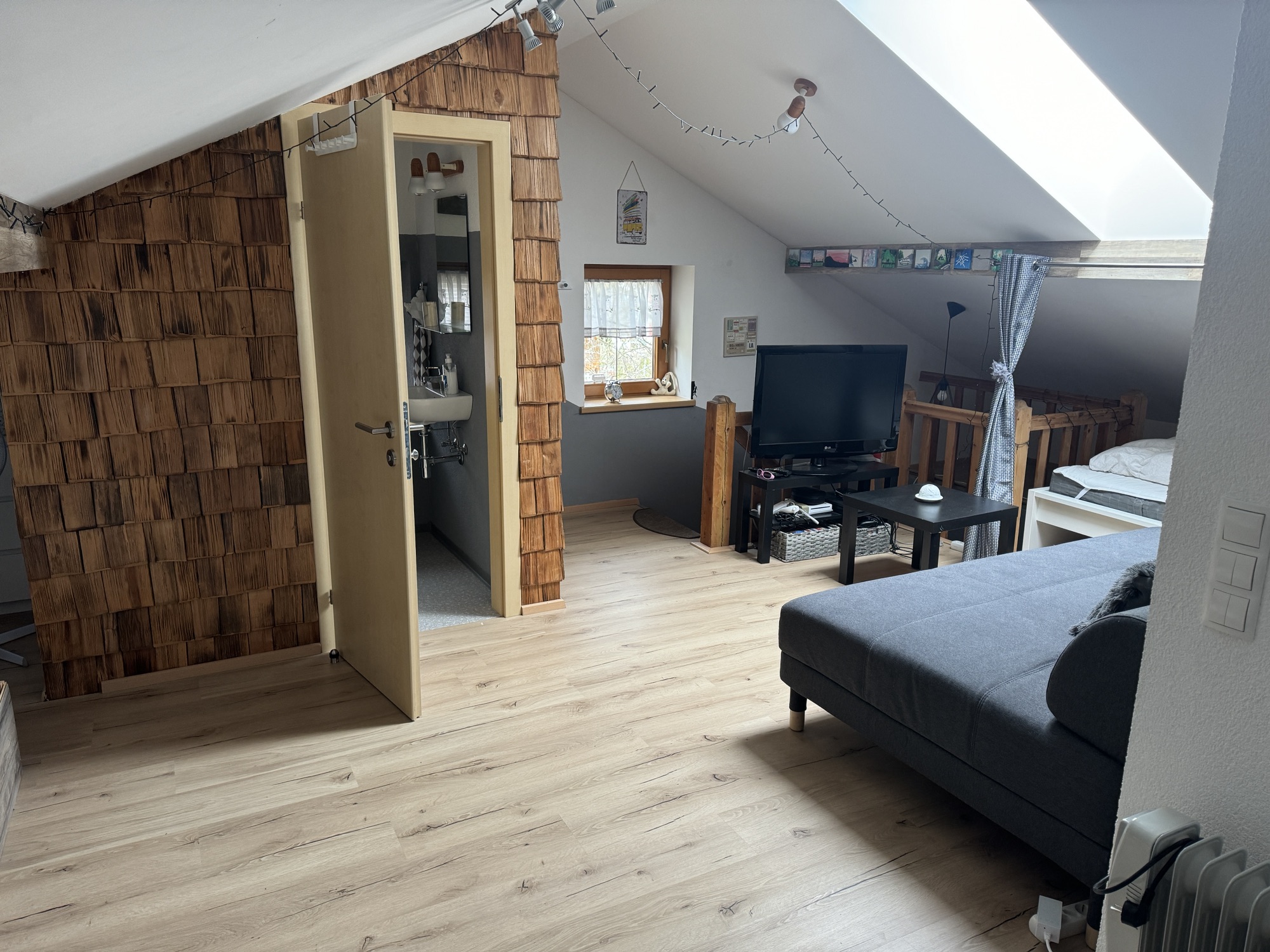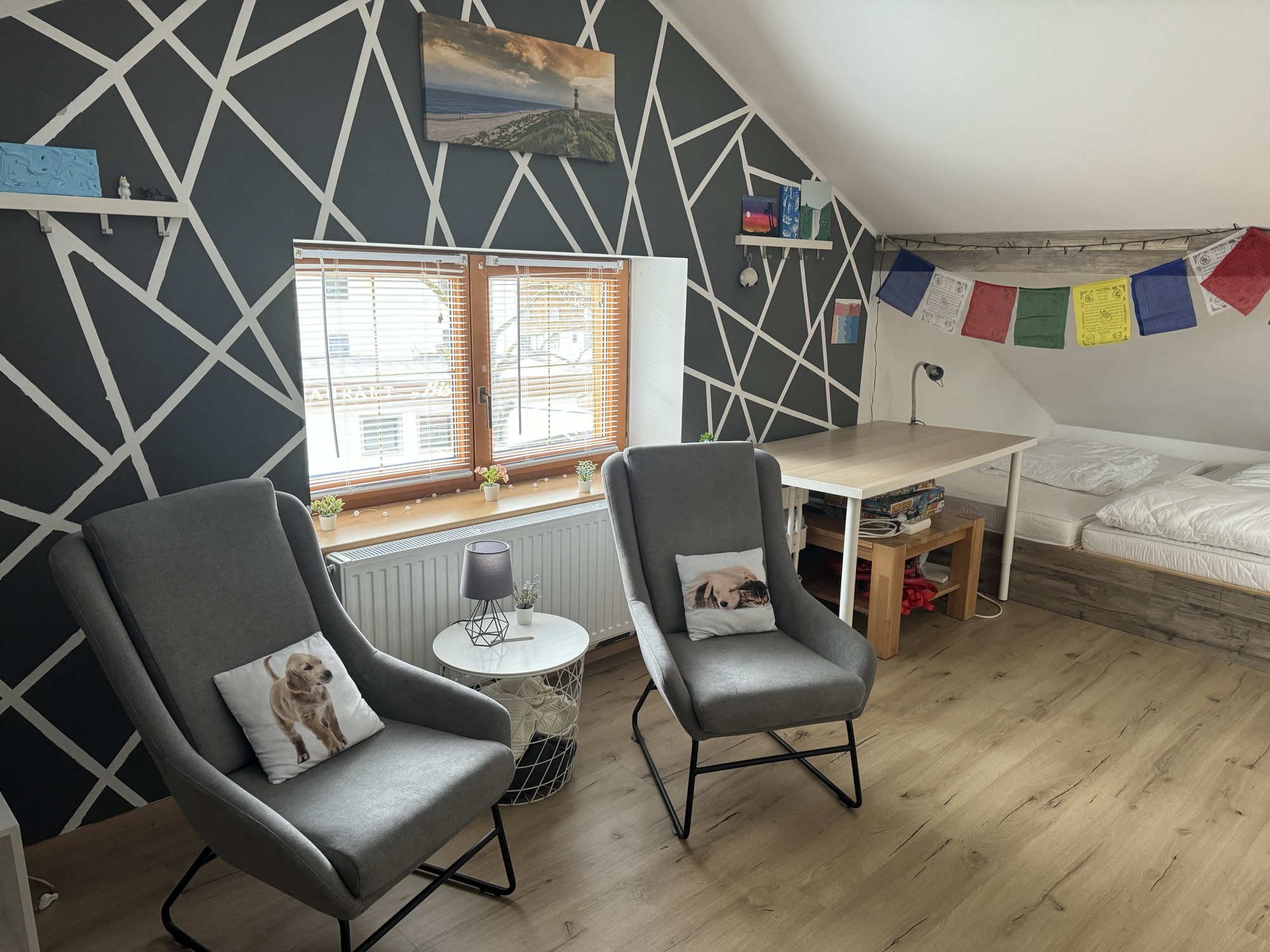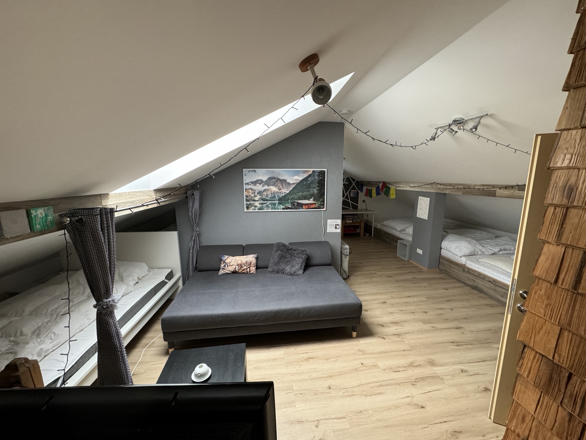 Í húsinu er íbúð á 2.hæð til leigu ásamt svefnlofti. Hægt er að leigja íbúðina með eða án svefnlofts. Íbúð með svefnlofti hentar vel fyrir tvær fjölskyldur, stórfjölskylduna eða vinahóp. Á svefnloftinu eru tvö hjónarúm, 6 rúm í flatsæng, svefnsófi og auka dýnur.